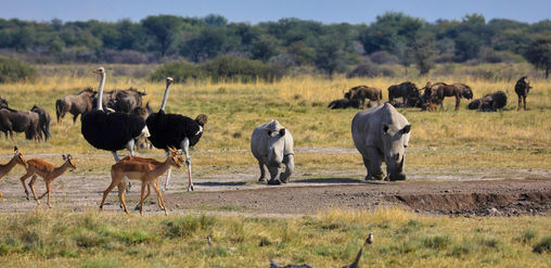 Das Morgenritual lief wie immer ab. Um halb neun waren wir auf der Strasse, die sehr gut ausgebaut war, so dass wir die 400 Kilometer bis unserem Tagesziel doch schnell hinter uns hatten. Kurz nach dem Mittag waren wir im Khama Rhino Sanctuary und wir bekamen da trotz keiner Reservation einen guten Stellplatz für die Nacht. Wir stellten uns hin und Kathrin machte einen leckeren Salat. Dann wollten wir einmal sehen, wo wir hier eigentlich waren. Wir fuhren in den Park. Beim ersten Wasserloch sahen wir erstmals Eland Antilopen. Das Licht war nicht optimal und die Tiere waren weit weg, doch es war definitiv eine Erstsichtung. Weiter fuhren wir Richtung zweites Wasserloch und sahen plötzlich zwei Nashörner. Das war sensationell. Wegen unserer Unerfahrenheit wussten wir noch nicht so genau, was für eines es war. Wir tuckerten weiter bis zum zweiten Wasserloch, wo wir noch mehr Nashörner sahen. Ein wenig später kamen Ranger mit Gewehren. Die waren da, um die Nashörner zu bewachen. Mit ihnen hielten wir einen Schatz ab und so erfuhren wir zwei Banausen, dass wir es hier mit Breitmaulnashörner zu tun hätten. Wenigstens waren wir lernfähig und lernwillig. Es gefiel uns hier ausserordentlich, darum buchten wir nach dem Gamedrive gleich noch für eine zweite Nacht. Wir kehrten noch beim Restaurant ein, denn da gab es Internet. Kathrins Eltern waren heute bei meinen Eltern zu Besuch und wir nutzten die Gelegenheit, mit einem Telefon alle zu erreichen. Zurück auf dem Stellplatz stellten wir routiniert das Dachzelt auf und bereiteten das Abendessen zu.