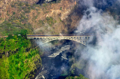 Im Hotel bekamen wir ein gutes Frühstück serviert. Dann setzten wir uns ins Auto und fuhren Richtung Wasserfälle. Zuerst mussten wir noch eine Busse bezahlen. Alle Tage mindestens eine Busse war hier das Motto. Beim Bahnübergang hatte ich nicht sauber angehalten, was wichtig war, denn da kommt ja jeden Tag ein Zug. Das wäre in etwa fünf Stunden so weit gewesen. Aber Ordnung muss sein. Also drückten wir wieder 20 Dollar ab, was wir und der Polizist mit Humor nahmen. Dann war es nur noch ein Katzensprung bis zum Parkeingang, der unmittelbar bei der Brücke und der Grenze zu Sambia war. Wir liefen zu den Wasserfällen und klapperten die Aussichtspunkte ab. Es hatte so extrem viel Wasser, dass wir von den Wasserfällen kaum etwas sahen. Dafür war es um so lauter. Wir waren patschnass, als wir wieder draussen waren. Nun hatte ich mit Kathrin erbarmen und wir fuhren nochmals zum Lookout Café. Da machten wir dann gemeinsam den Gorge Swing. Für den Nachmittag hatten wir einen Rundflug mit einem Microlight Flugzeug. Der ging aber von der sambischen Seite aus. Also gingen wir zurück zur Brücke, wo wir für ein paar Stunden nach Sambia einreisten. Das klappte besser als gedacht und so hatten wir Zeit, uns noch die sambische Seite der Wasserfälle anzuschauen. Das wollte Kathrin nicht mitmachen, denn sie hatte keine Lust, nochmals durchnässt zu werden. Ich machte es alleine. Wir wurden dann am Grenzposten abgeholt und zum Startplatz gefahren. Da standen zwei Deltasegler mit zwei Sitzen und einem Motörchen bereit und nach kurzer Einweisung bekamen eine Jacke. Dann war es schon so weit und es konnte losgehen. Wir setzten uns in die Stühle, wurden angegurtet und schon ging es auf die Startbahn. Kurz darauf waren wir in der Luft und kreisten über den Wasserfällen. Von oben sahen wir nun wesentlich mehr als von Land. Die Wassermassen waren extrem eindrücklich. Weil wir den langen Flug gebucht hatten, flogen wir noch etwas flussaufwärts über den National Park. Von oben sahen wir nochmals einige Tiere wie Elefanten, Hippos und Krokodile. Dann landeten wir wieder sicher. Der Flug hatte richtig Spass gemacht. Wir wurden zurück an die Grenze gebracht, wo wir wieder in Simbabwe einreisten. Nach dem Motto, wenn schon, denn schon…. wollten wir das volle Programm erleben und buchten für den morgigen Tag noch einen Helikopterflug. Das Abendessen nahmen wir in einem thailändischen Restaurant. In Victoria Falls war der Tourismus ganz schön international. Dann waren wir definitiv bettreif.
