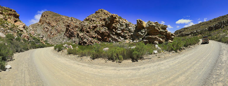 Am nächsten Morgen war der Himmel immer noch stark bewölkt. So leuchteten die Felsen nicht rot. Wir fuhren los, liessen Carlitzdorp hinter uns und bogen auf die Gravel Road durch die Seweweekspoort. Die Strasse schlängelte sich durch die spektakuläre Schlucht durch die Swartberge. Je tiefer wir in die Schlucht kamen, um so besser wurde das Wetter. Wir machten viele Fotostopps und fanden es sehr schön hier. Am Ende der Schlucht angekommen waren wir wieder in der Karoo und vom schlechten Wetter war nichts mehr zu sehen.